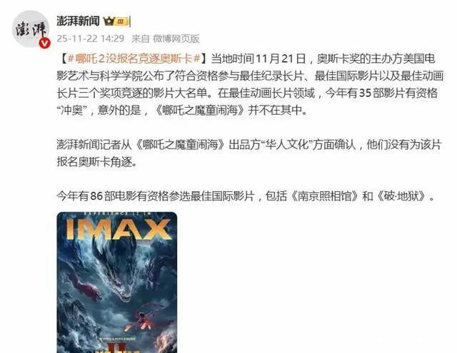 未报名奥斯卡 金鸡奖没领奖的事刚刚过去,11月22日,又爆出了《哪吒2》没有报名奥斯卡评选的新闻。 11月21日,奥斯卡奖的主办方美国电影艺术与科学学院公布了符合资格参与各个奖项角逐的影片名单, 而在最佳动画长篇领域,大家并没有看到《哪吒之魔童闹海》的名字。